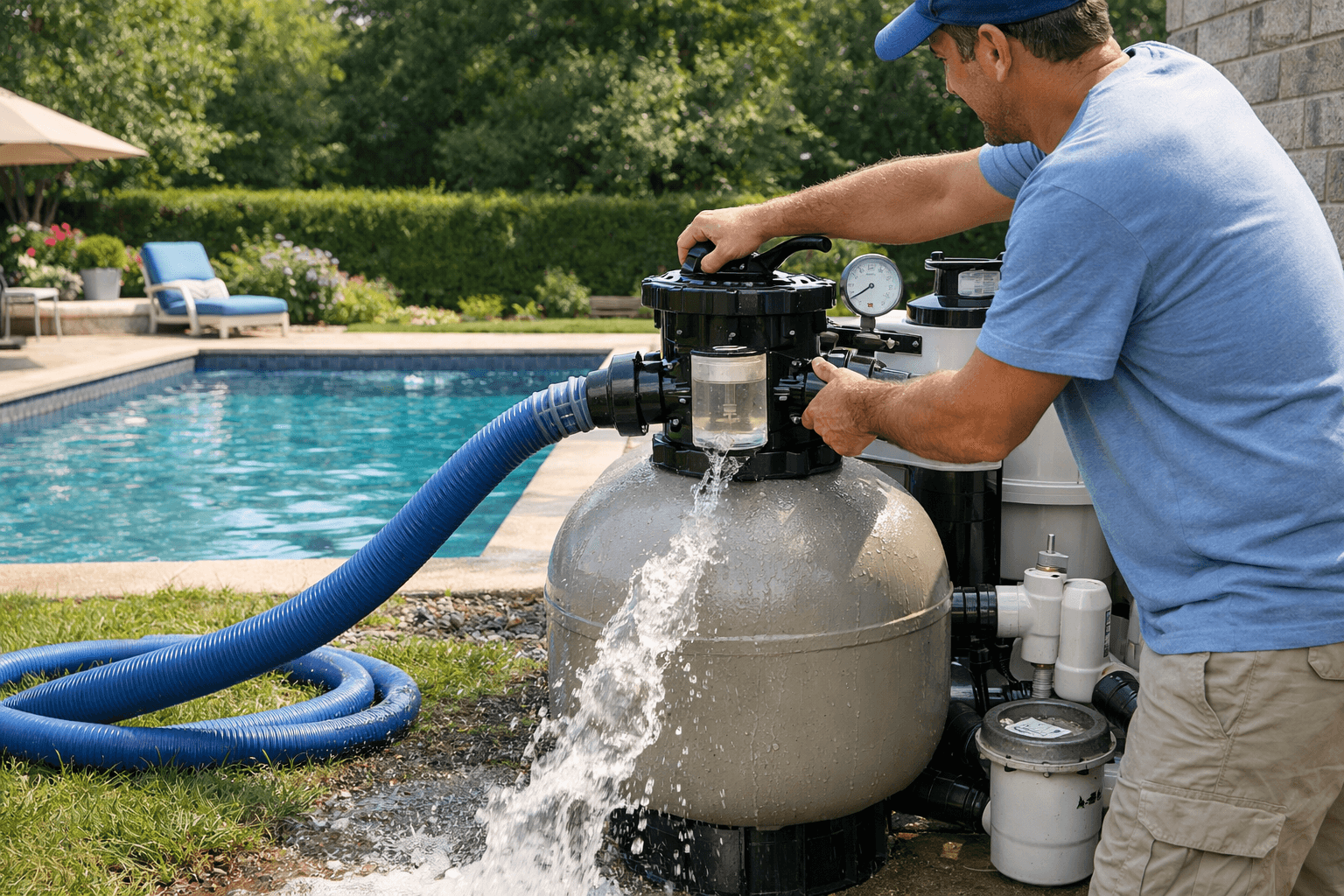 În perioadele foarte calde, când piscina e folosită mult, filtrarea mai lungă ajută. Nu e nevoie să rulezi totul la maximum, dar un program bine gândit, cu circulație constantă, ține particulele în mișcare și le duce către filtru. Apoi spălarea inversă devine un gest periodic, nu o alergătură din două în două zile.